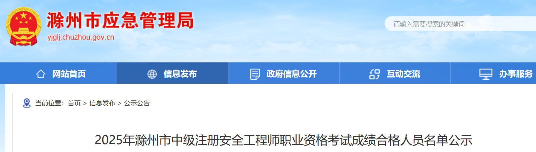 根据省人社厅《关于专业技术人员资格考试告知承诺制试点工作有关事宜的通知》(皖人社秘〔2020〕41号)文件精神及《关于做好2025年度滁州市中级注册安全工程师职业资格考试成绩合格人员公示抽查工作的函》有关要求,现将2025年度滁州市中级注册安全工程师成绩合格人员名单予以公示,公示时间至1月15日。在公示期间内如对通过人员持有异议,请以书面形式向我局反映。