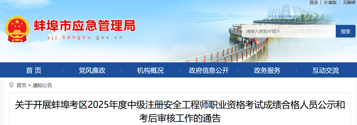 按照考试要求,市人社局、市应急局于近期联合开展蚌埠考区2025年度中级注册安全工程师职业资格考试成绩合格人员公示和考后审核工作,现将有关情况通告如下: