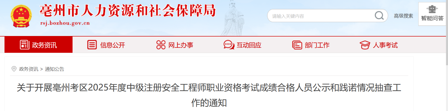 根据省人力资源社会保障厅《关于专业技术人员资格考试告知承诺制试点工作有关事宜的通知》(皖人社秘〔2020〕41 号)有关要求,拟于近期开展亳州考区2025年度中级注册安全工程师职业资格考试成绩合格人员公示和践诺情况随机抽查工作。现将有关情况通知如下。
