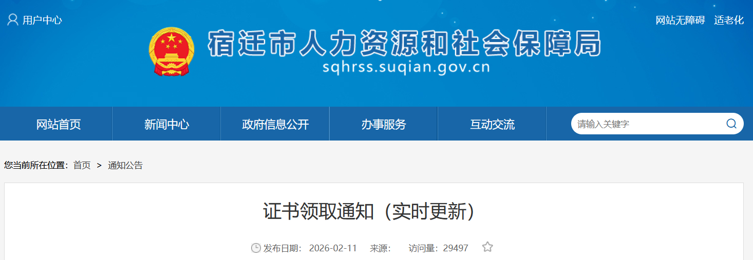 2025年江苏宿迁中级注册安全工程师资格证书已于2026年2月11日开始发放。根据市人社局通知,同期发放的还有高级统计、统计专业资格证书。