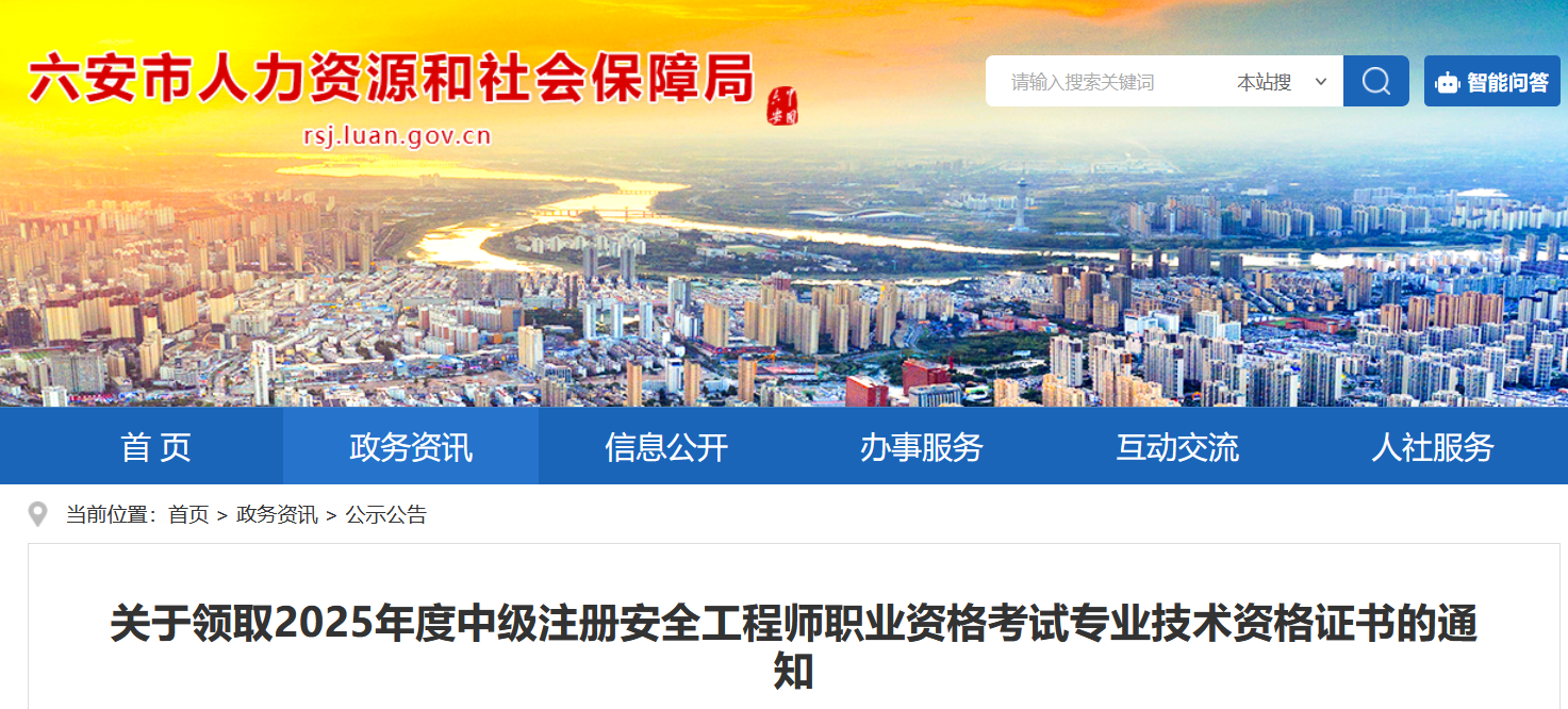 2025年度中级注册安全工程师职业资格考试专业技术资格证书已可领取,现将有关事项通知如下: