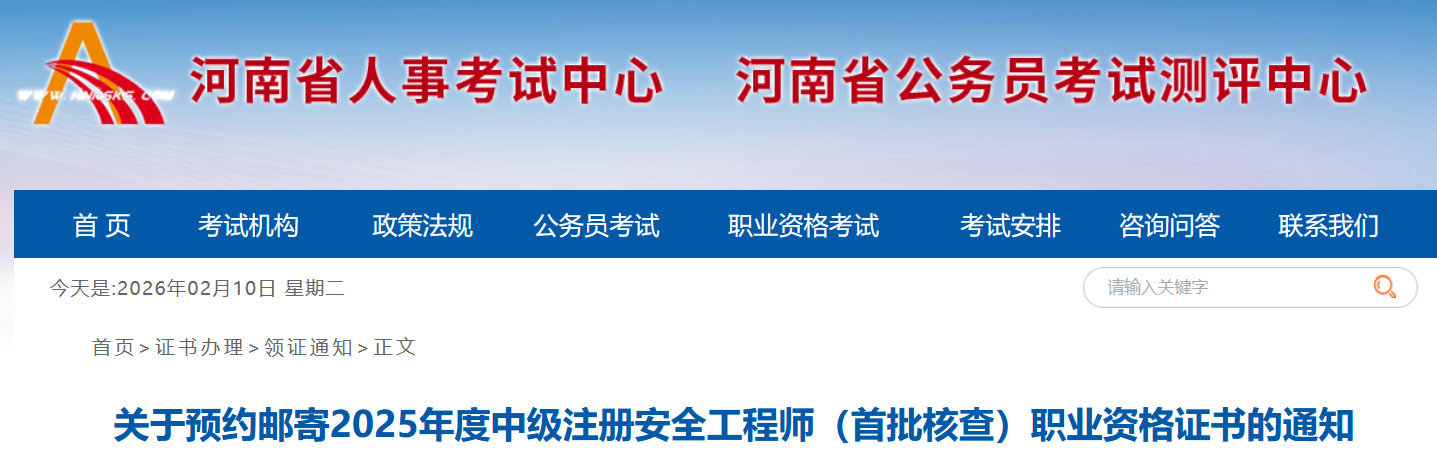 河南省启动2025年度中级注册安全工程师职业资格考试成绩合格(首批核查)人员证书预约邮寄工作。预约期为2026年2月9日至3月10日,逾期不再受理。考生可通过支付宝"豫事办"小程序或微信"河南省人事考试中心"公众号申请邮寄。证书由中国邮政寄送,费用自理。