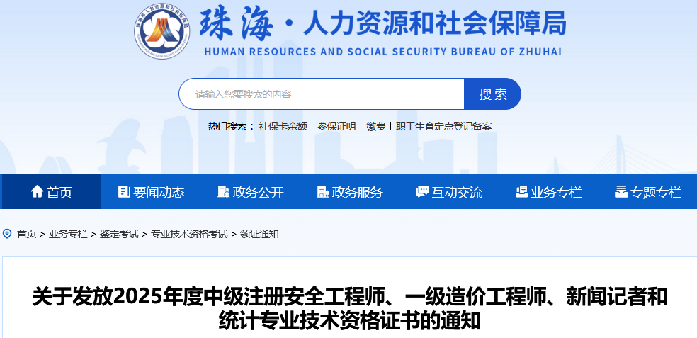 我院定于2026年2月5日开始发放2025年度中级注册安全工程师、一级造价工程师、新闻记者和统计专业技术资格证书。考试成绩全科合格且资格复核通过的珠海考区考生,可按以下方式领取: