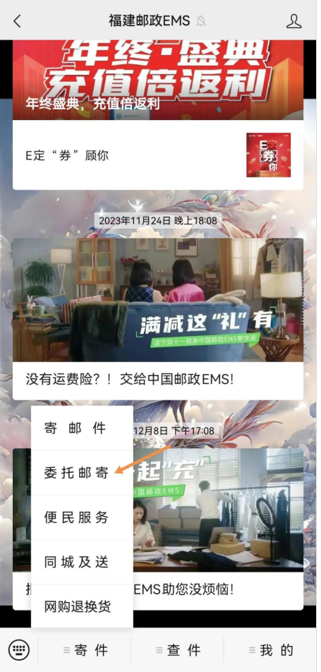 步骤一:关注“福建邮政EMS”微信公众号,选择“寄件”