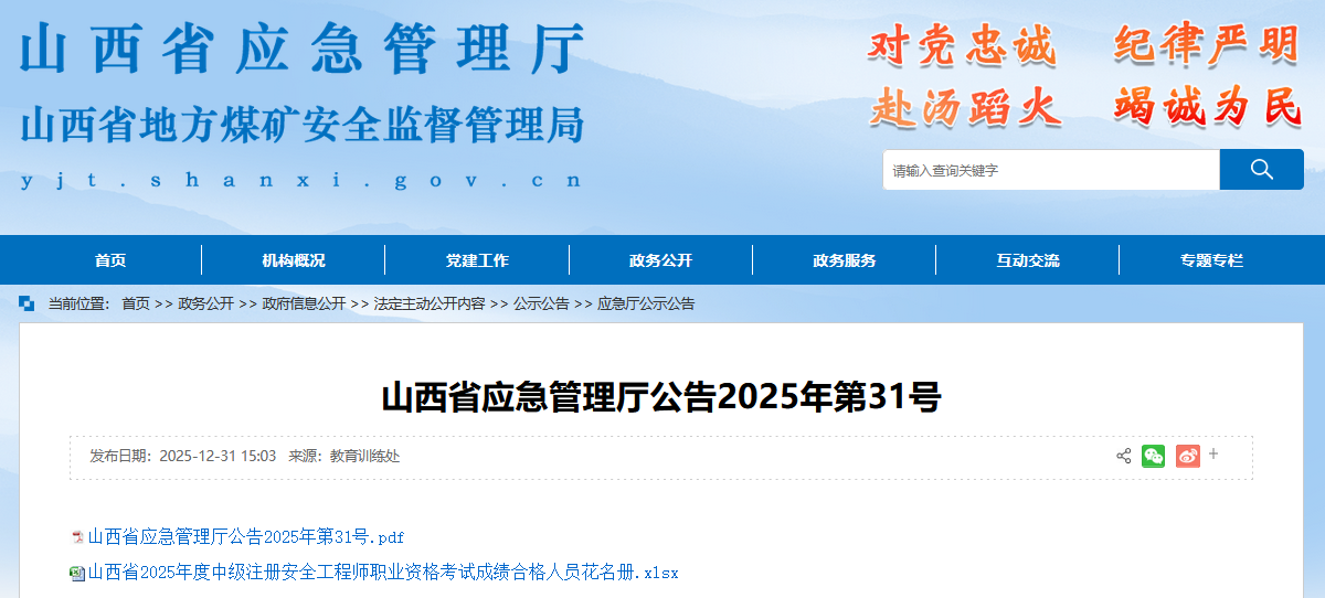 附件:1.山西省2025年度中级注册安全工程师职业资格考试成绩合格人员名单(略。请到省应急管理厅官网政务公开栏目“公示公告”查询)