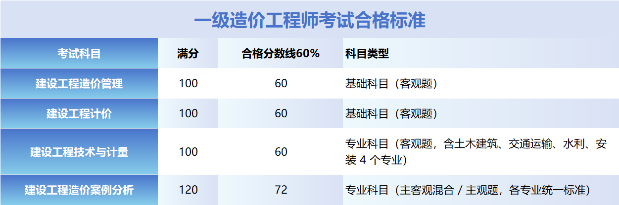 根据人力资源和社会保障部规定,一级造价师各科合格标准均为卷面总分的60%,具体如下: