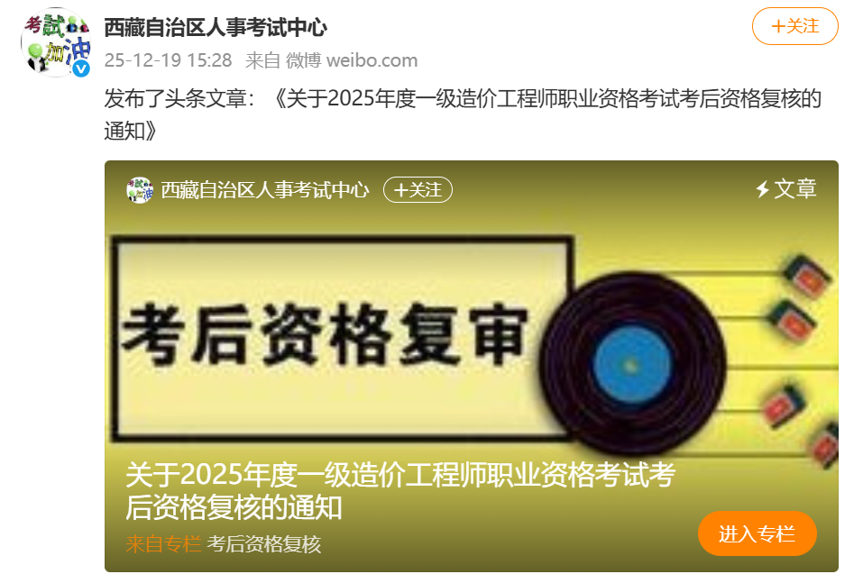 2025年12月19日,西藏自治区人事考试中心发布《关于2025年度一级造价工程师职业资格考试考后资格复核的通知》,请相关人员于12月22日-25日规定时段内通过线上提交(建议办理方式)或现场提交两种方式办理资格复核。