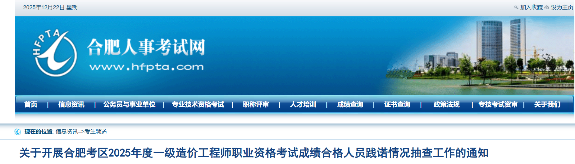 2025年12月22日,合肥人事考试网发布《关于开展合肥考区2025年度一级造价工程师职业资格考试成绩合格人员践诺情况抽查工作的通知》,启动一级造价师合格人员践诺抽查,55名考生上榜。需于12月23日-30日16:00登录指定平台,上传身份证、社保等材料,逾期视为放弃。