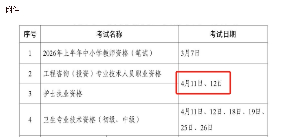 2026年注册咨询工程师考试时间为:4月11日、12日(周六、周日),该时间来自人力资源社会保障部办公厅《关于2026年度专业技术人员职业资格考试工作计划及有关事项的通知》,为全国统一、固定考试时间,无地区差异。