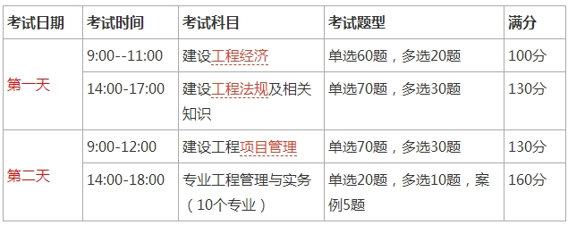 一级建造师考试开考2天,共四个科目,其中专业科目分10个专业。每年一级建造师考试时间及科目安排如下: