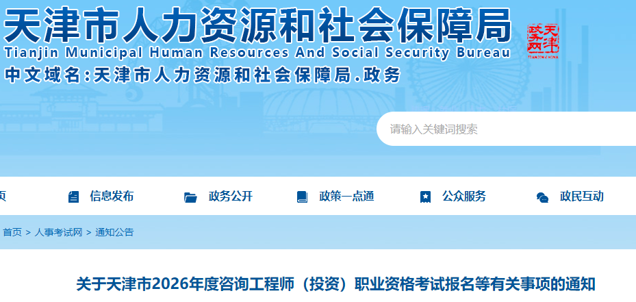 2月27日,天津市人才考评中心发布了“关于天津市2026年度咨询工程师(投资)职业资格考试报名等有关事项的通知”,通知公布:2026年天津咨询工程师报名时间为3月3日-9日;线上审核3月4日开启;缴费时间为3月3日-13日;打印准考证时间为4月8日-10日。通知原文如下: