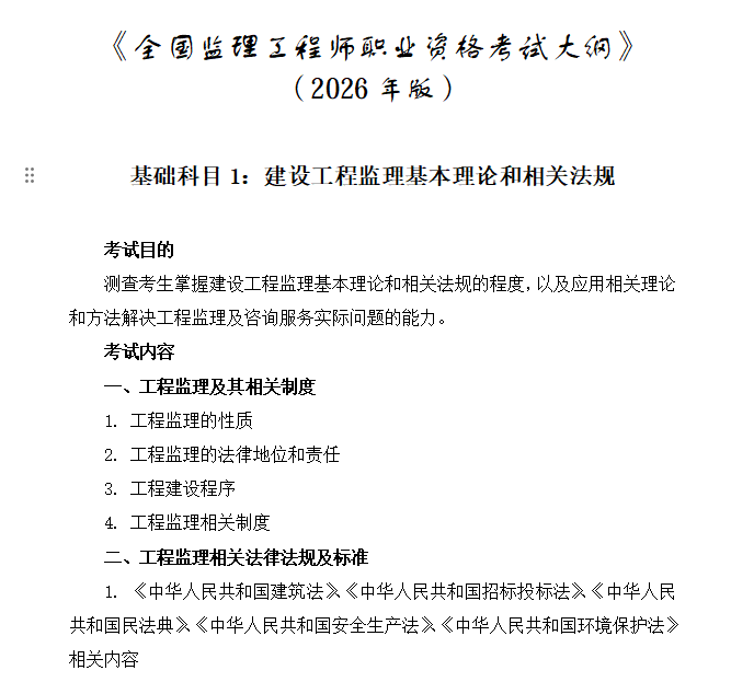 2026年注册监理工程师职业资格考试新大纲已正式发布,此次更新的考试大纲包括基础科目和土建专业科目,新版大纲替代旧版大纲全面适用于2026年度考试。新大纲紧扣行业数字化、绿色化转型趋势,优化考核层级与专业侧重,明确了“了解、熟悉、掌握”三类考点要求,考生需精准对接变动方向,高效规划备考。