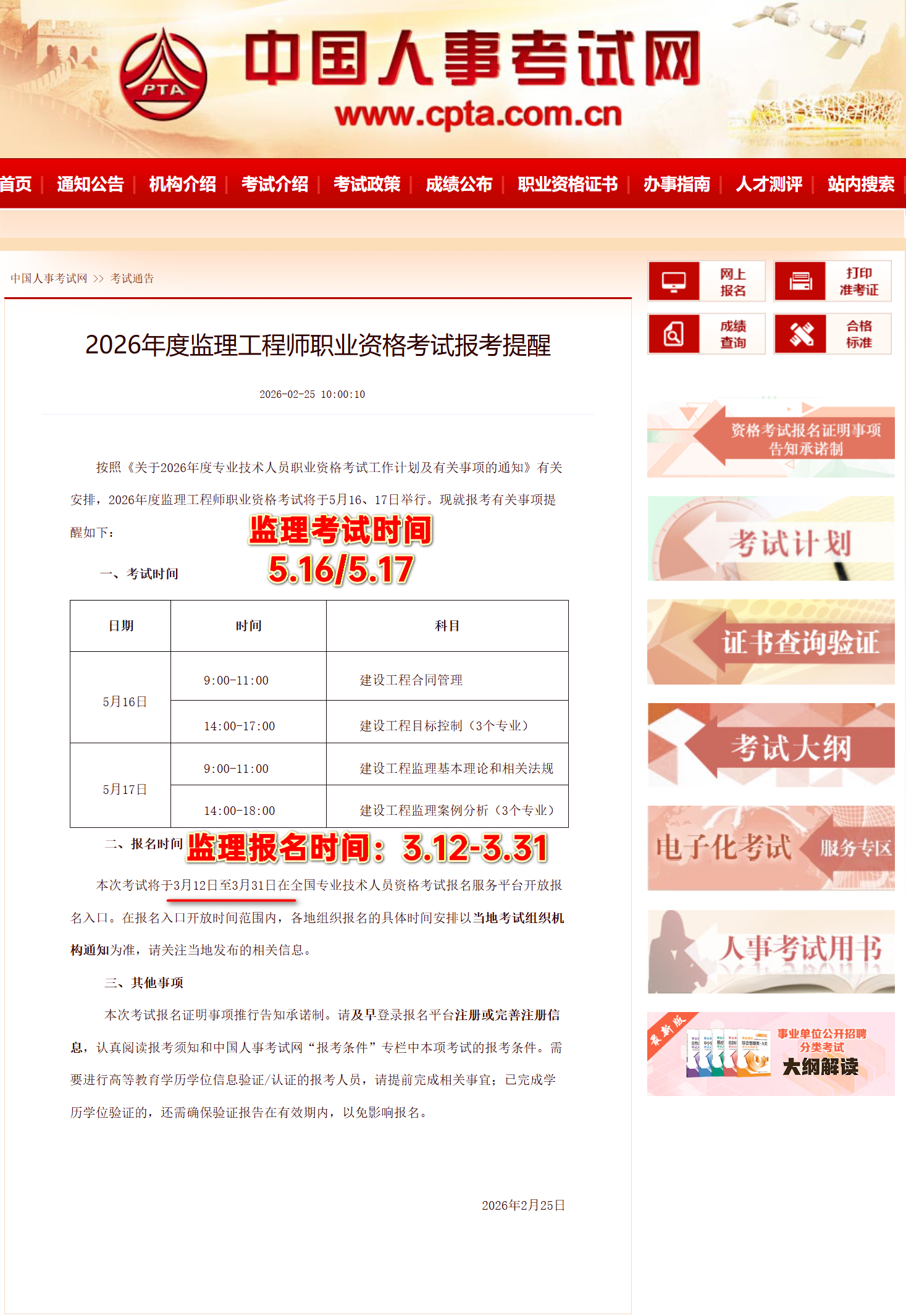 根据人力资源和社会保障部人事考试中心的统一安排,2026年监理工程师考试报名工作将通过 “全国专业技术人员资格考试报名服务平台” 进行。该平台即广大考生所熟知的 中国人事考试网,其官方网址为:www.cpta.com.cn。这是全国范围内唯一指定的官方报名渠道,请考生务必认准,避免误入非官方网站。