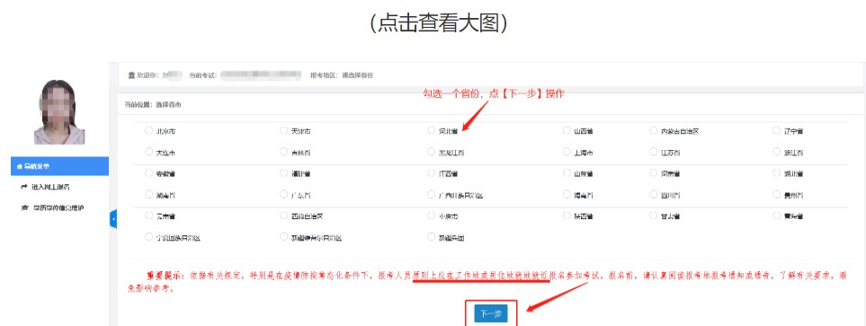 根据报名属地原则(通常在户籍地或工作所在地报考),选择对应的省市作为“考区”。