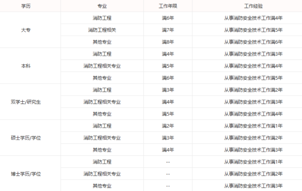 双学士/研究生:消防工程专业工作满3年,其中从事消防安全技术工作满2年;消防工程相关专业工作满4年,其中从事消防安全技术工作满3年;其他专业工作满5年,其中从事消防安全技术工作满4年。