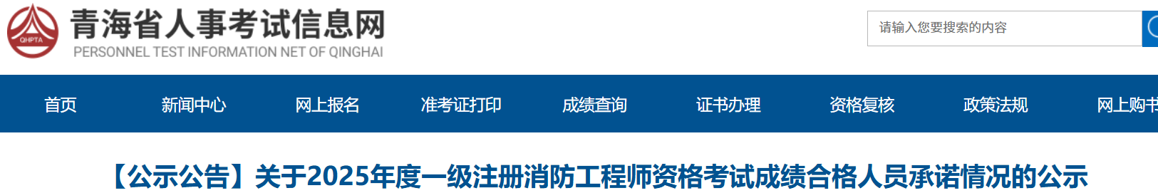 1月21日青海省人事考试信息网发布通知《关于2025年度一级注册消防工程师资格考试成绩合格人员承诺情况的公示》,其中公布了2025年青海一级消防工程师成绩合格人员名单,公示期为2026年1月21日至1月30日。
