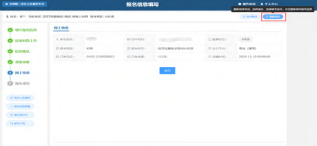 如果报名信息填写错误需要重新报名,点击右上角重新报名可以重新选择考试、选择省份、选择报考条件、并且重新填写报考信息。如下图所示: