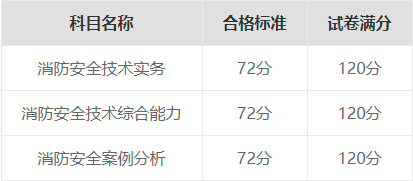 中国人事考试网发布的《关于部分专业技术人员职业资格考试合格标准有关事项的通告》,明确了一级注册消防工程师考试各科目合格标准按照试卷满分的60%划定。即“消防安全技术实务”“消防安全技术综合能力”和“消防安全案例分析”三个科目合格标准均为72分(试卷满分为120分)。