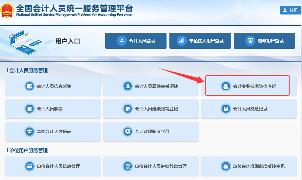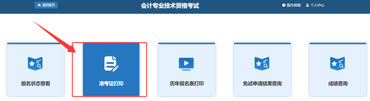 第2步:登录成功后,点击“会计专业技术资格考试”或考试服务下的“准考证打印”按钮进入