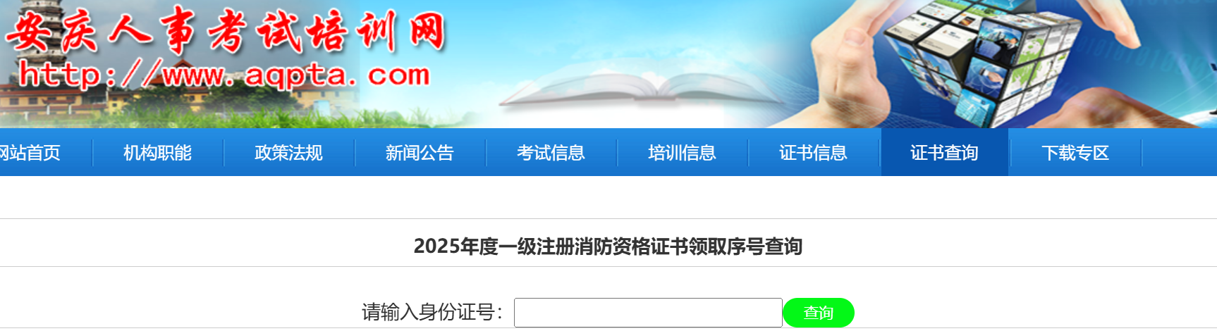 2月24日安庆人事考试培训网开通2025年一级消防工程师第一批证书序号查询入口,需要输入身份证号码进行查询。