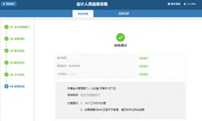 工作经历页面点击下一步,进入到会计管理部门页面。在会计管理部门页选择所在会计管理部门省、市、区县。关系到后续信息采集审核等一系列操作,请认真核对后,勾选“承诺所提供信息真实有效”后提交审核,如下图所示: