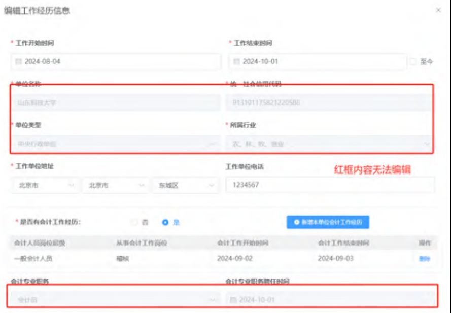 用户需要点击“编辑”对原信息缺失项进行补充,并且原始信息是无法进行编辑的,若经过核实原始信息有误的,需要删掉本条记录后新增工作经历信息。