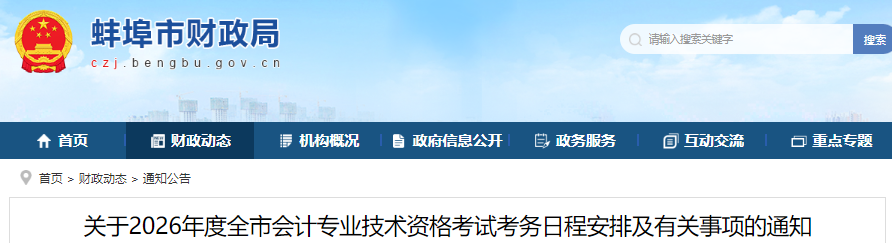12月11日,蚌埠市财政局发布了《于2026年度全市会计专业技术资格考试考务日程安排及有关事项的通知》,其中明确2026年蚌埠初级会计报名时间为1月5日至1月27日12:00,考试于2026年5月16日至18日举行,共6个批次。