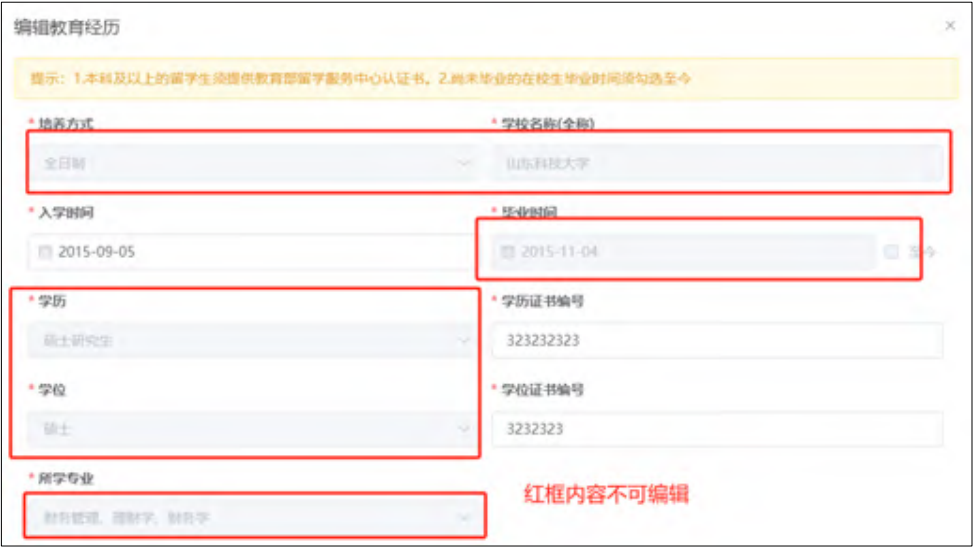 用户需要点击“编辑”对原信息缺失项进行补充,并且原始信息是无法进行编辑的,若经过核实原始信息有误的,需要删掉本条记录后新增教育经历信息。