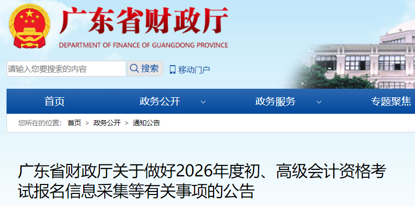 12月15日,广东省财政厅发布了《关于做好2026年度初、高级会计资格考试报名信息采集等有关事项的公告》,其中明确2026年度初级会计报名采取“信息采集、网上报名、自动审核、网上缴费”方式,本文介绍信息采集时间、采集要求、信息采集所需资料等内容。