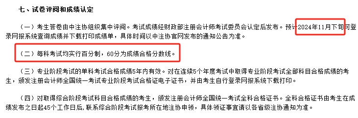 中注协在《2024年注册会计师全国统一考试报名简章》中明确说明:2024年注会考试成绩预计在11月下旬公布。注会专业阶段考试的单科考试合格成绩5年内有效。