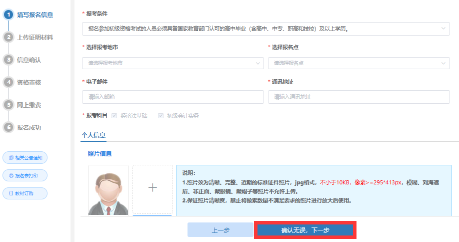 (1)照片须为清晰、完整、近期的标准证件照片,jpg格式,不小于10KB,像素>=295*413px,模糊、刘海遮眉、非正面、戴眼镜、戴帽子等照片不允许上传。