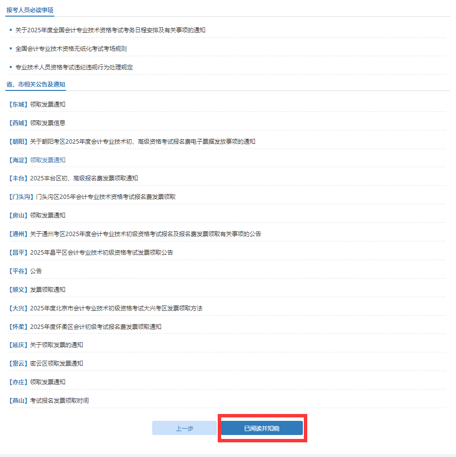 5. 完成阅读须知后,进入到所选择省份设置的通知公告页面,包括报考人员必读事项以及省、市相关公告及通知。点击【已阅读并知晓】。