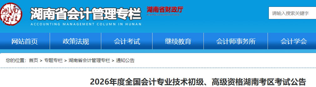 根据全国会计考办《关于2026年度全国会计专业技术资格考试考务日程安排及有关事项的通知》(会考〔2025〕2号)规定,现将2026年度全国会计专业技术初级资格湖南考区考试有关事项公告如下: