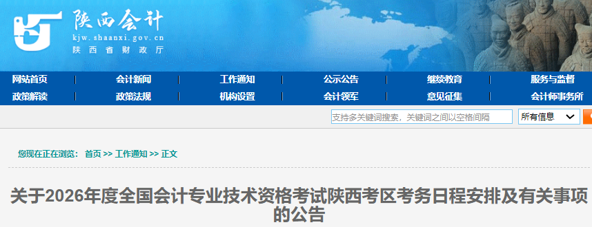根据全国会计专业技术资格考试领导小组办公室《关于2026年度全国会计专业技术资格考试考务日程安排及有关事项的通知》(会考〔2025〕2号)要求,2026年度全国会计专业技术资格(以下简称会计资格)考试采用无纸化方式,考试分别于2026年5月(初级)举行。现就陕西考区考试考务日程安排及有关事项通知如下: