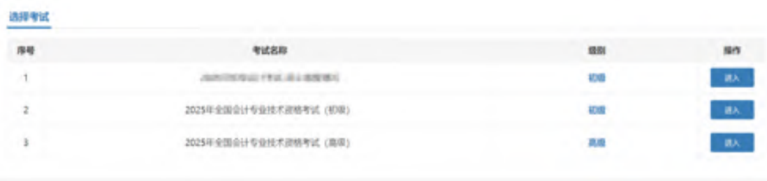 点击“会计专业技术资格考试”,会直接进入到选择考试界面,在选择考试界面可以查看已创建的考试,考试信息包括考试名称以及级别,点击操作列表中的“进入”按钮进行该场考试的报名,如下图所示: