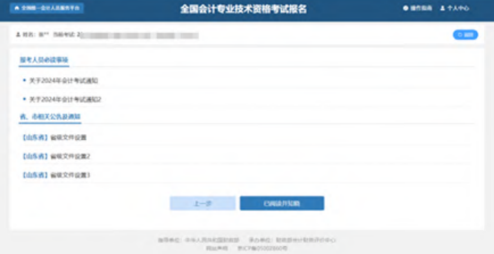 完成阅读须知后,进入到所选择省份设置的通知公告页面,包括报考人员必读事项以及省、市相关公告及通知。点击“已阅读并知晓”,进行下一步。如下图所示: