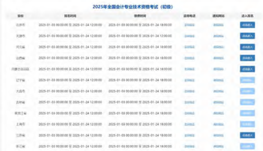 进入到本场考试的省份选择页面,省份选择信息包括省份、报名时间、缴费时间、咨询电话以及通知网站。其中,只有当前日期在报名时间范围内,省份信息列表后面的 “点击进入”按钮才会开放。咨询电话为咨询电话详情弹窗,通知网站为每个省份的报名通知网站链接跳转。如下图: