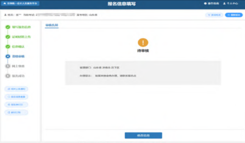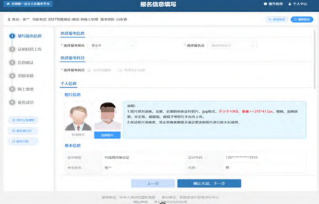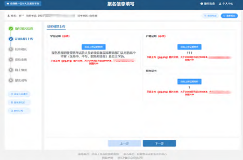 报考信息填写完毕后点击“确认无误,下一步”,进入到证明材料上传页面(注:各省报名流程及证明材料略有差异)。如下图所示: