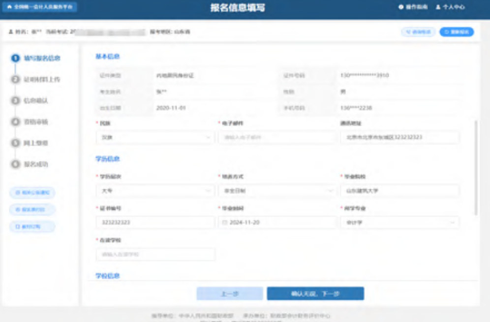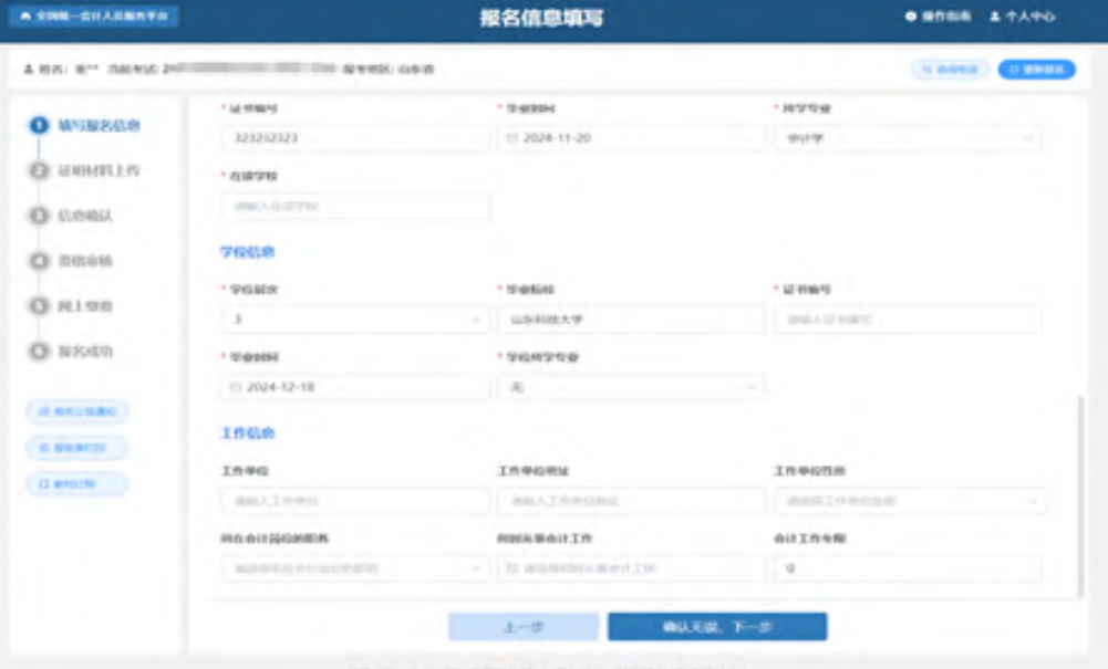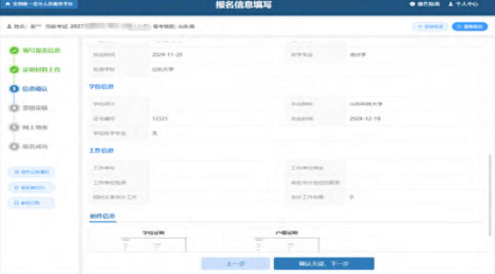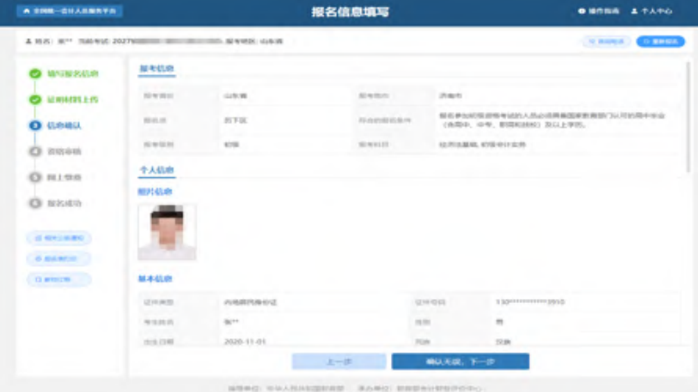 点击下一步后进入到信息确认页面,信息确认页面展示报考信息、个人信息(照片信息、基本信息、学历信息、学位信息、工作信息)、附件信息。如下图所示: