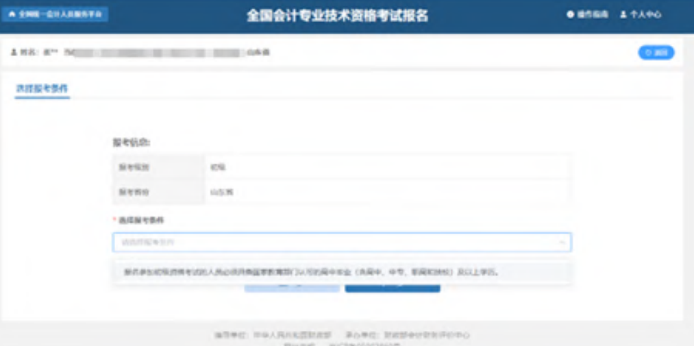 进入到选择报考条件页面,页面展示报名信息,包含报考级别以及报考省份。在选择完报考条件后,点击下一步。如下图所示: