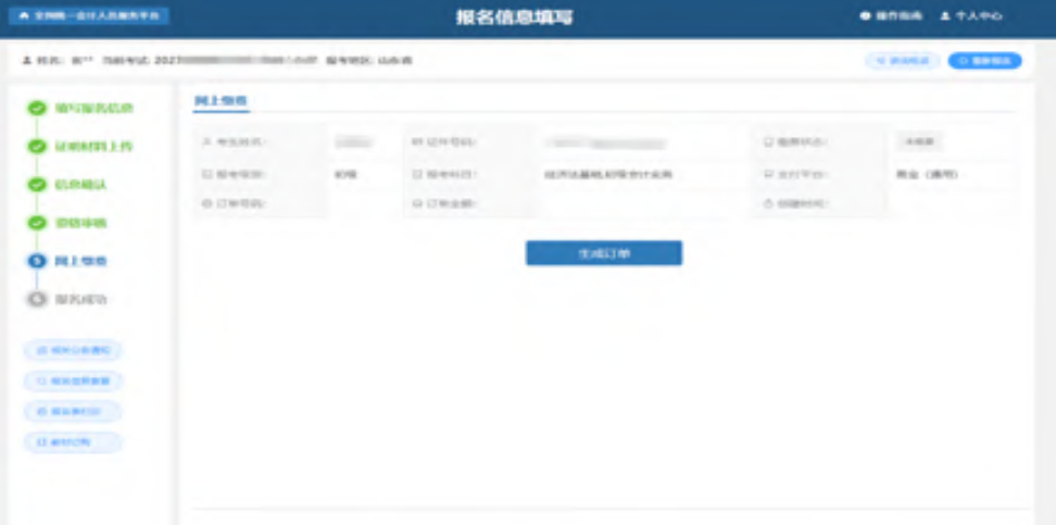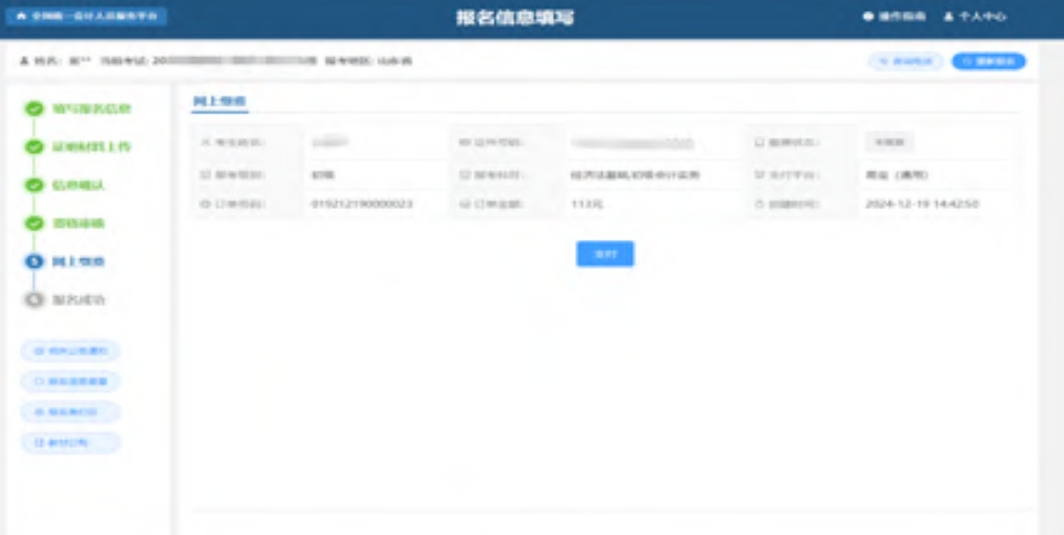 等待审核通过后,重新选择考试会直接进入到网上缴费的页面。页面展示考生报名基本信息、订单基本信息、支付平台以及缴费状态信息。如下图所示: