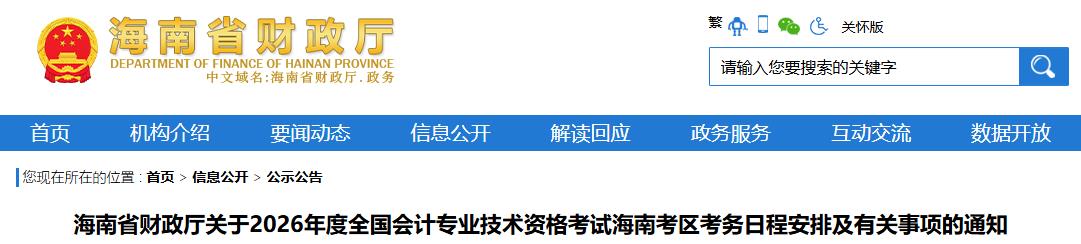 海南省财政厅关于2026年度全国会计专业技术资格考试海南考区考务日程安排及有关事项的通知