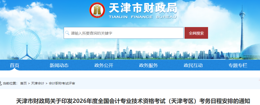 根据全国会计专业技术资格考试领导小组办公室《关于2026年度全国会计专业技术资格考试考务日程安排及有关事项的通知》(会考〔2025〕2号),2026年度全国会计专业技术资格(以下简称会计资格)考试采用无纸化方式,分别于2026年5月(初级)举行。现就2026年度会计资格考试(天津考区)考务日程安排及有关事项通知如下。