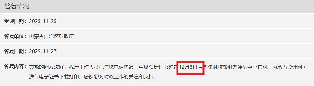 答复内容:尊敬的网友您好!我厅工作人员已与您电话沟通,中级会计证书约在12月8日后登陆财政部财务评价中心官网、内蒙古会计网可进行电子证书下载打印。感谢您对财政工作的关注和支持。
