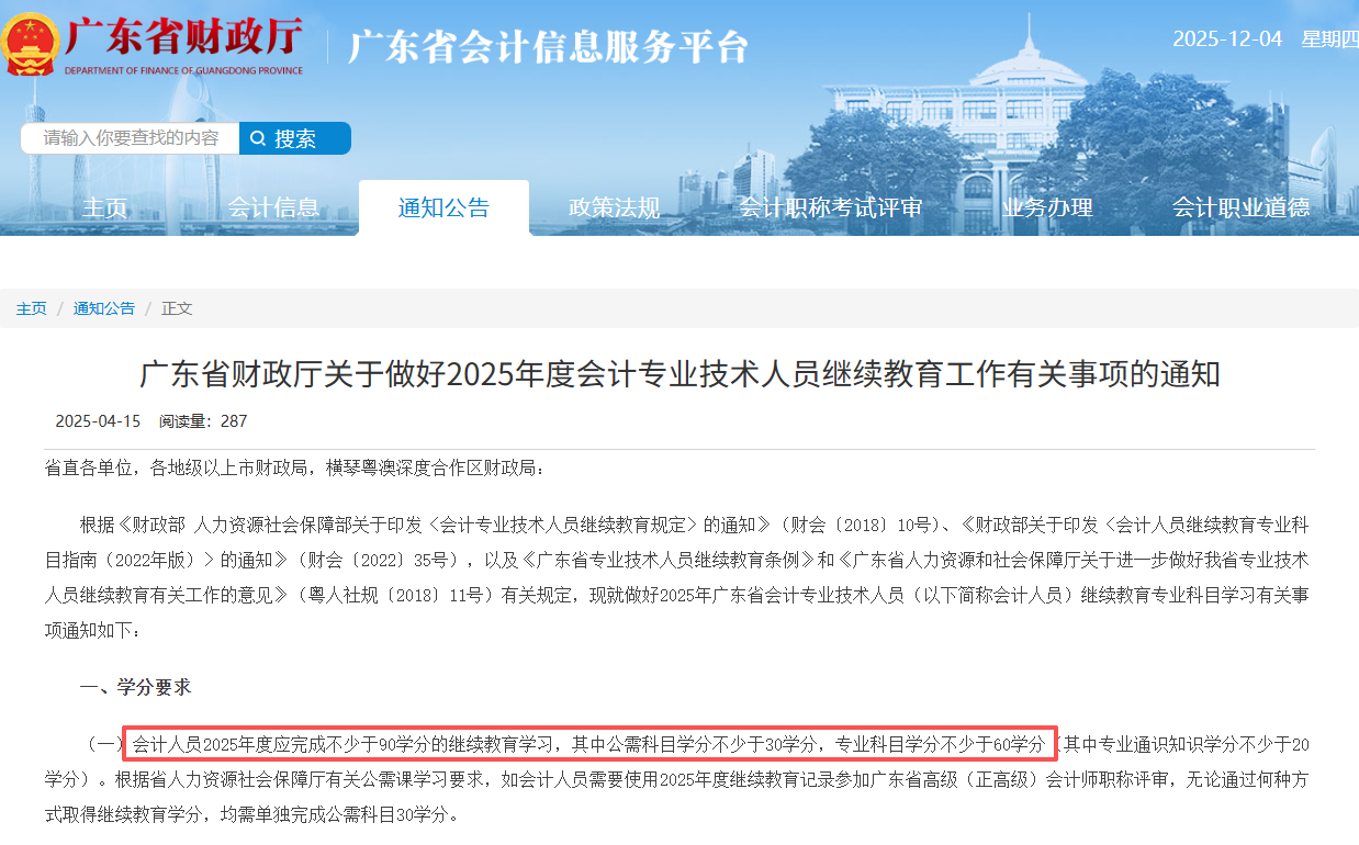 以广东为例,广东在25年会计继续教育通知中明确:会计人员2025年度应完成不少于90学分的继续教育学习,其中公需科目学分不少于30学分,专业科目学分不少于60学分。