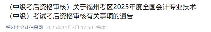 (中级考后资格审核)关于福州考区2025年度全国会计专业技术(中级)考试考后资格审核有关事项的通告