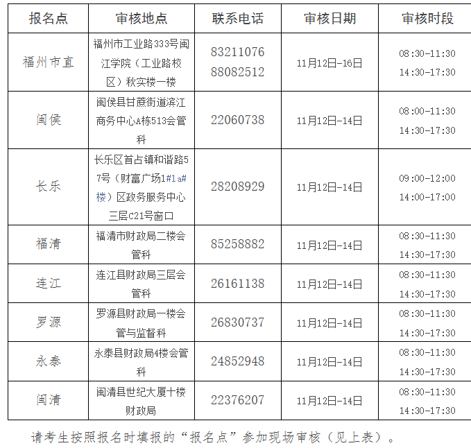 2.非福州市直的考生按照相应报名点安排的审核日期(11月12-14日)参加现场审核。