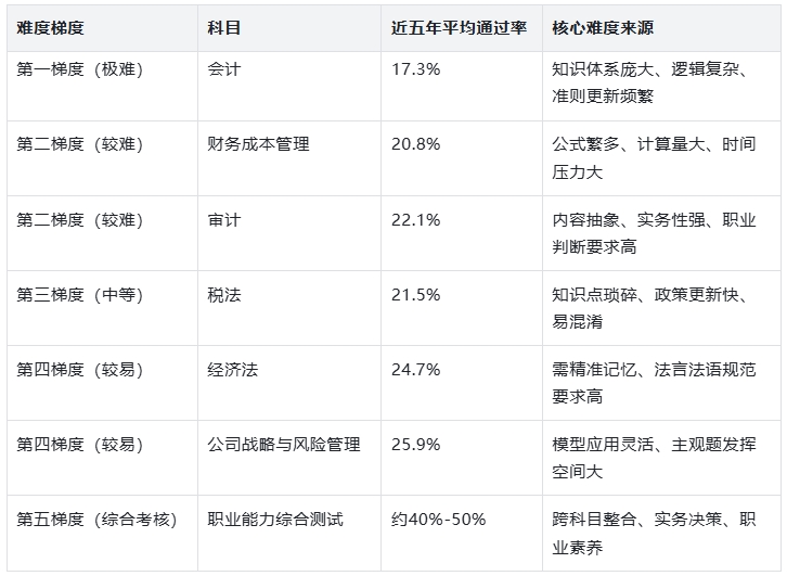 结合近五年官方通过率、试题难度系数(取值0-1,越接近0难度越高)及2024年考生反馈,CPA“6+1”科目难度可划分为以下梯度,其中专业阶段难度差异显著,综合阶段侧重综合能力而非单一难度。