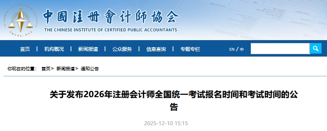12月10日,中国注册会计师协会发布了《关于发布2026年注册会计师全国统一考试报名时间和考试时间的公告》,其中公布了2026年注册会计师报名时间为4月7日-4月30日,缴费时间为6月15日-6月30日,考试时间为8月29日-30日。