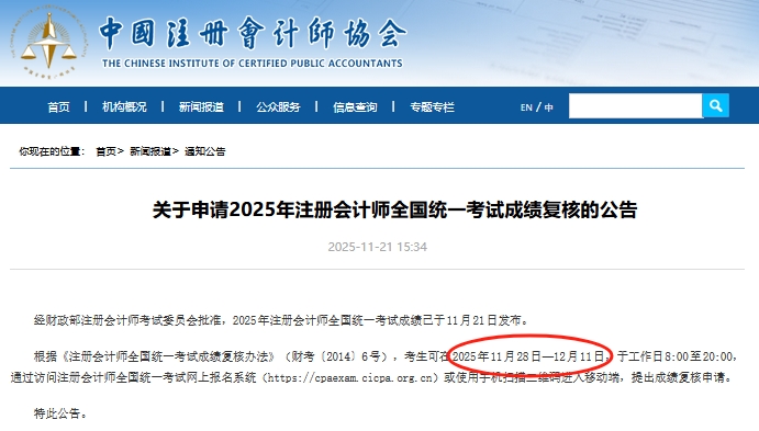 根据《注册会计师全国统一考试成绩复核办法》(财考〔2014〕6号),考生可在2025年11月28日——12月11日,于工作日8:00至20:00,通过访问注册会计师全国统一考试网上报名系统(https://cpaexam.cicpa.org.cn)或使用手机进入移动端,提出成绩复核申请。